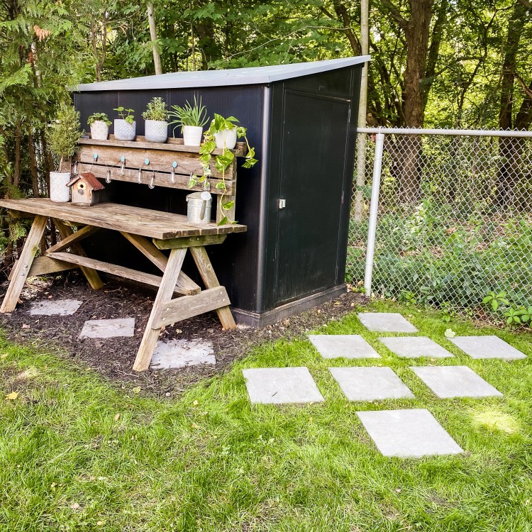I cannot take the credit for this whole backyard. Our amazingly talented friend at Ireland Design created a beautiful patio space for us. I did a much smaller portion of the backyard facelift. We had two very awkward raised gardens in each corner of our yard and I took on the task of removing them and trying to even out the ground, and I have to say I am quite proud of that. We moved our shed, gave it a coat of paint and added some stone pavers to complete the space. One thing I learned, I will be leaving the landscaping to the experts. I do not have the patience to level out the ground. The final result is one of those good from afar but far from good things for sure.