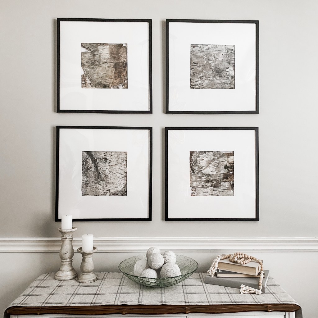 Finding some fallen birch trees at the cottage led to this project. I had bought 4 lovely frames and was trying to decide what photographs to include. I couldn’t make up my mind, so in went the pieces of birch bark. They compliment the neutral colours and natural materials throughout the house.